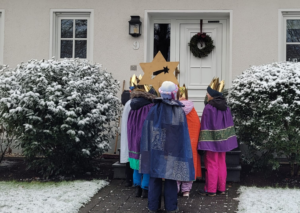 So sah es in diesem Jahr aus, als die Sternsinger in Rodenkirchen von Haus zu Haus gingen, um den Segen in die Familien zu tragen und Spenden für unser Partnerprojekt in Duékoué zu sammeln. Es war kalt, es hatte geschneit und trotz der Widrigkeiten des Wetters waren neun Gruppen eifrig unterwegs.